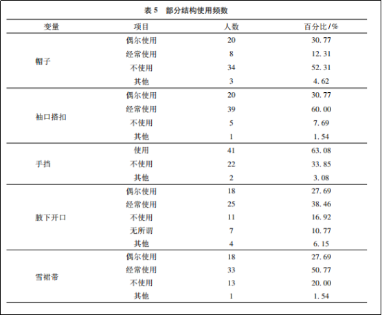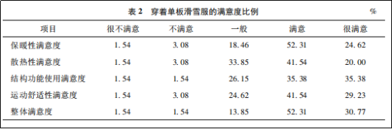 接下來作者從“保暖性滿意度”、“散熱性滿意度”、“結(jié)構(gòu)功能使用滿意度”、“運動舒適性滿意度”、“整體滿意度”五個方面對消費者滿意度進行了調(diào)查。情況如下: