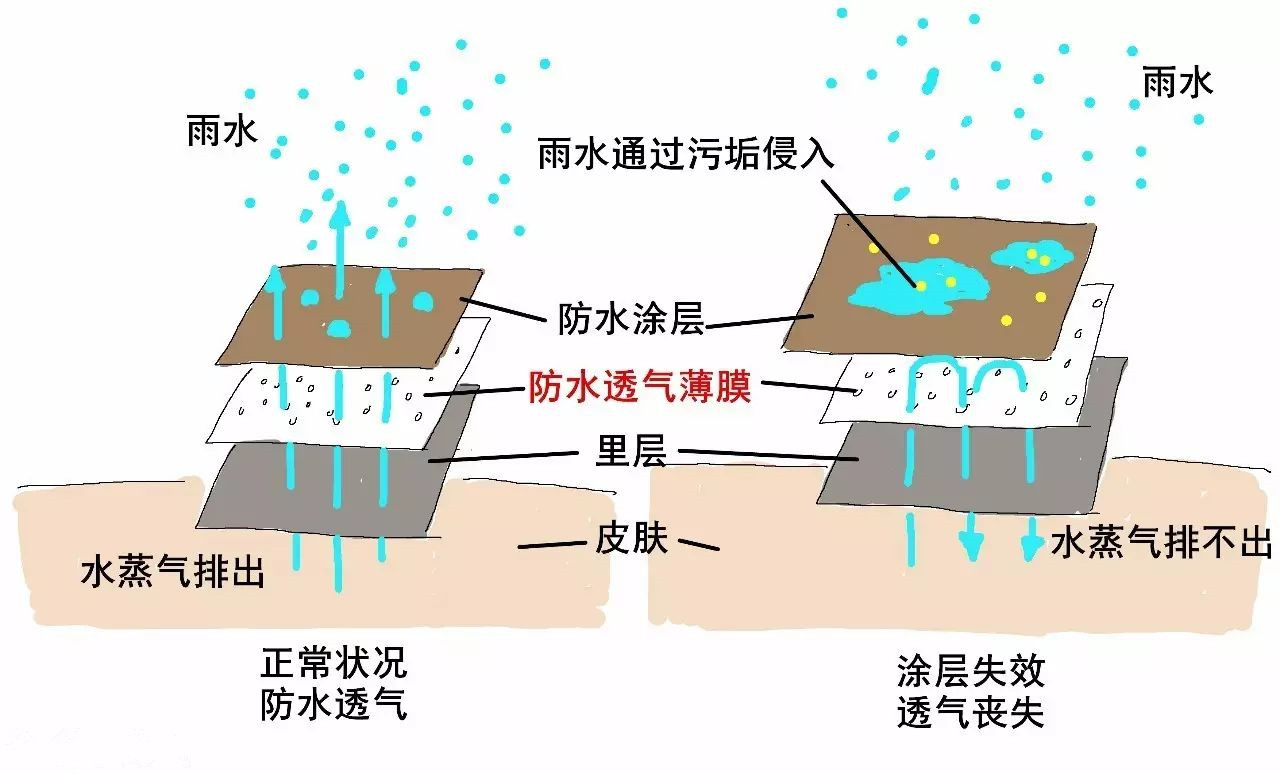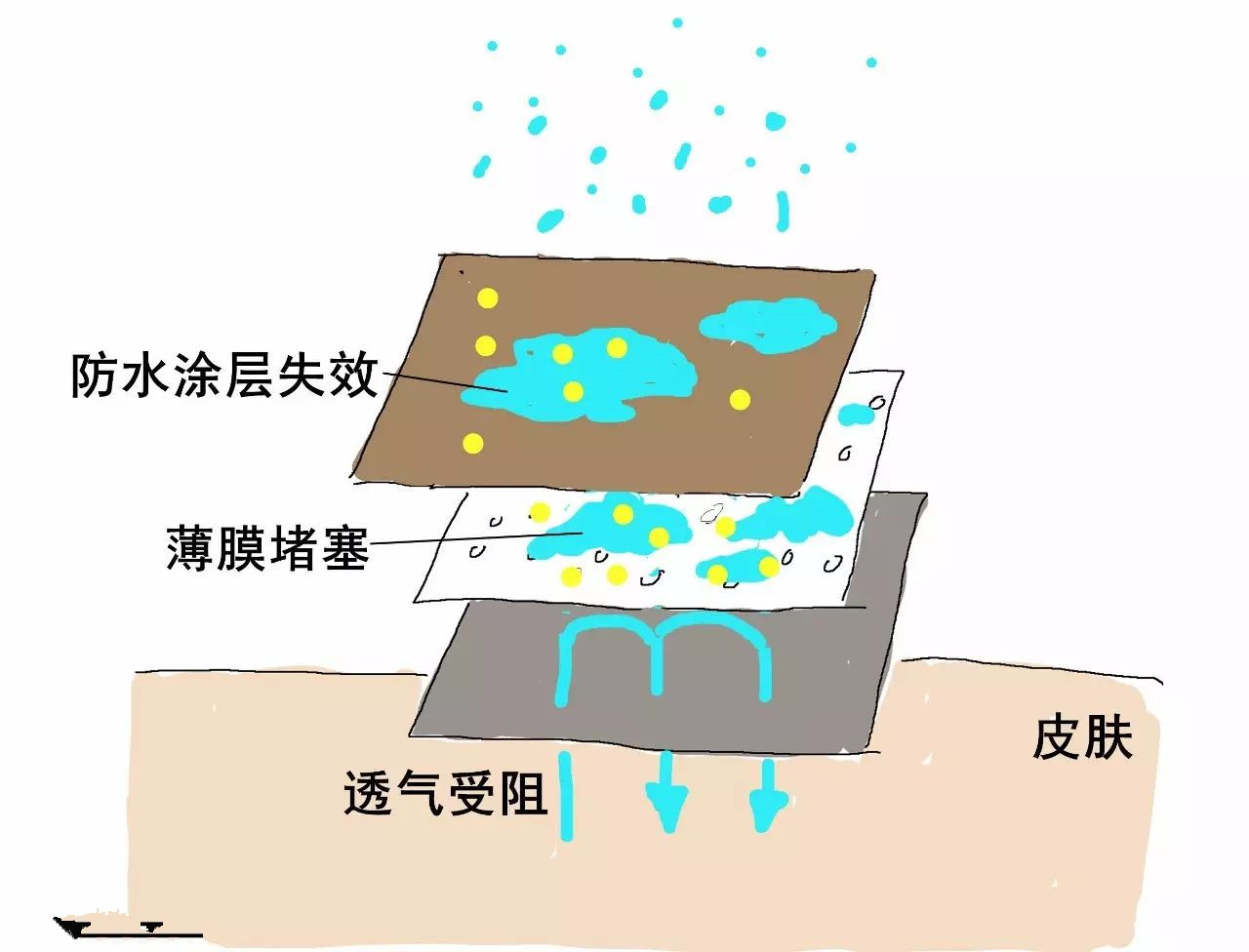 對(duì)有薄膜的沖鋒衣而言,如果污垢只是讓涂層失效,雨水并不會(huì)進(jìn)入身體,但涂層失效讓水蒸氣無(wú)法逃逸,透氣功能也就失效。