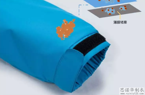 薄膜堵塞:當(dāng)污垢通過第一層保護(hù)層時(shí),很容易開始侵入中間層的薄膜,薄膜被污垢堵塞。 這是整個(gè)保護(hù)系統(tǒng)的核心區(qū)域,夾克的防水透氣功能慢慢丟失!