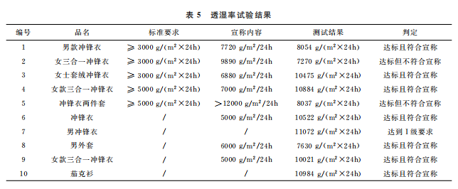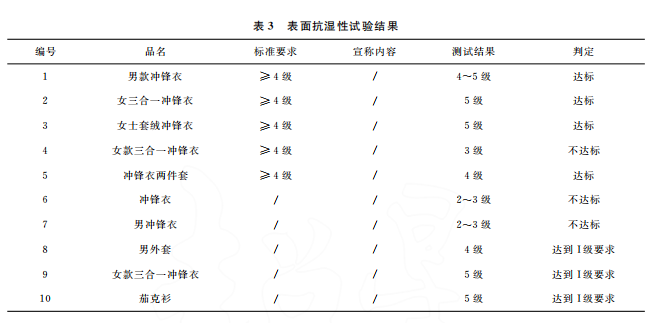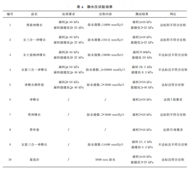本文最終的判定是結(jié)合 GB/T32614—2016《戶外運動服裝 沖鋒衣》中面料功能性要求和產(chǎn)品銷售時的吊牌宣稱進行。達標(biāo)是指符合沖鋒衣的合格品 標(biāo) 準(zhǔn) 要 求,反 之 則 不 符 合。10 件 樣 品中,只有5件達標(biāo),且只有3件是符合吊牌宣稱內(nèi)容。其中,標(biāo)示了 GB/T32614—2016的沖鋒衣,有3件達標(biāo),合格率為60%。近年來,監(jiān)管部門的抽查合格率一般在80%左右。這次比較試驗合格率偏低的原因可能是樣品量較少,樣品的價格區(qū)間比較集中,且考核了接縫處的靜水壓。值得注意的是有2件沒有標(biāo)示 GB/T32614—2016的外套,其性能都符合標(biāo)準(zhǔn)要求。此外,銷售方對靜水壓的宣稱都偏高,有3件達標(biāo)了卻不符合自身的宣稱內(nèi)容。沖鋒衣 GB/T32614—2016標(biāo)準(zhǔn) 中 I級 對 靜 水 壓 的 要 求 也 只是:面料≥50kPa和面料接縫處≥50kPa,銷售 方卻往往宣稱100kPa,甚至達150kPa,而且也沒有充分考慮到面料接縫處靜水壓值會相對偏小的現(xiàn)實。需要警 醒 的 是,5 件 標(biāo) 示 了 GB/T32614—2016的沖鋒衣其綜合宣傳都不符合規(guī)定,存在執(zhí)行標(biāo)準(zhǔn)標(biāo)注正確卻夸大宣傳的嫌疑。