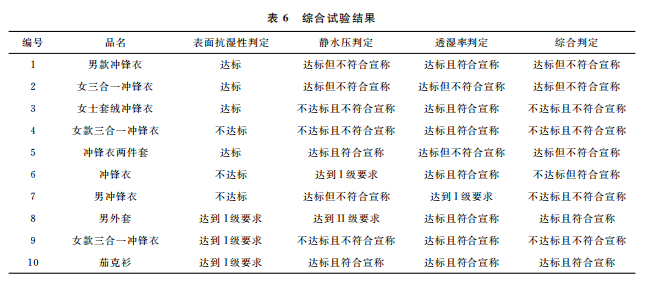 表面抗?jié)裥浴㈧o水壓和透濕率綜合統(tǒng)計的測試結(jié)果見表6。