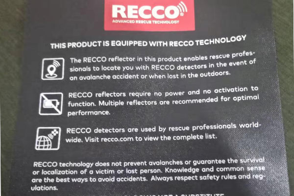 思諾華服飾&睿牛制衣是一家20年主營沖鋒衣、滑雪服的定制生產(chǎn)廠家,20年制作研究戶外服裝,戶外服裝的制作工藝、功能性都要求嚴(yán)格,對于這一RECCO,它是雪崩救援系統(tǒng)的簡稱,RECCO 是用于定位雪崩受難者的電子系統(tǒng)。