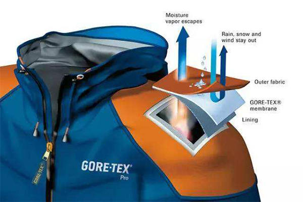 (1)一種是EPTFE復膜的微孔型面料,目前國內(nèi)多是GORE-TEX、DENTIK、EVENT、3TO1-TEX這幾種。它防水透氣的功能是在服裝的外面料上復合一層微孔薄膜,其中的微孔比水滴分子小,又比氣體分子大,可以在阻擋雨水的同時揮發(fā)自身的汗氣。