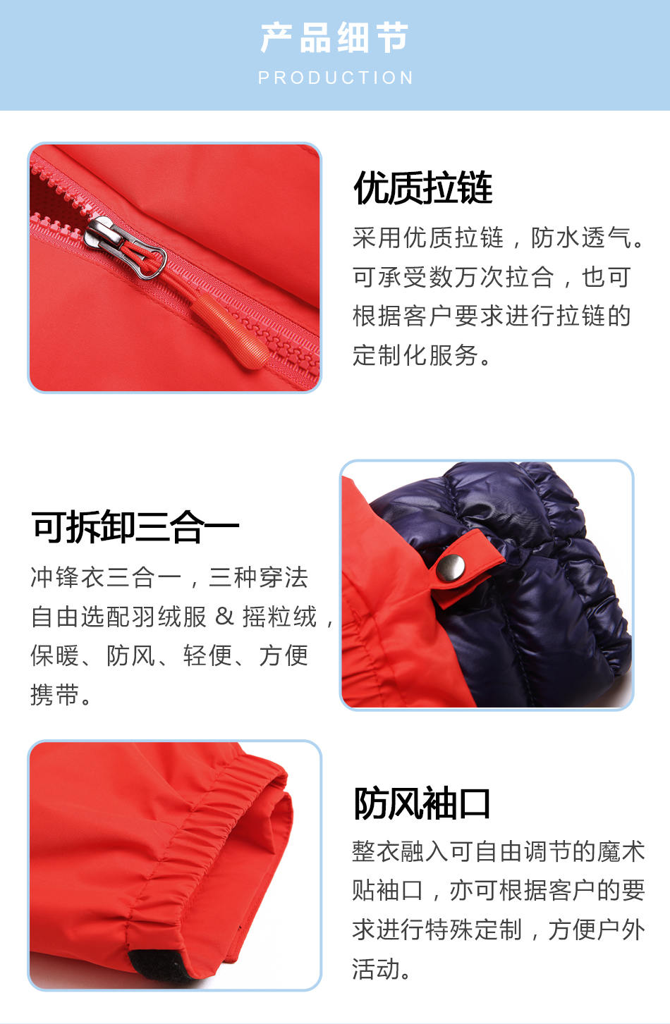 可拆卸三合一:校服沖鋒衣三合一,三種穿法自由選配羽絨服&搖粒絨,保暖、防風、輕便、方便攜帶。