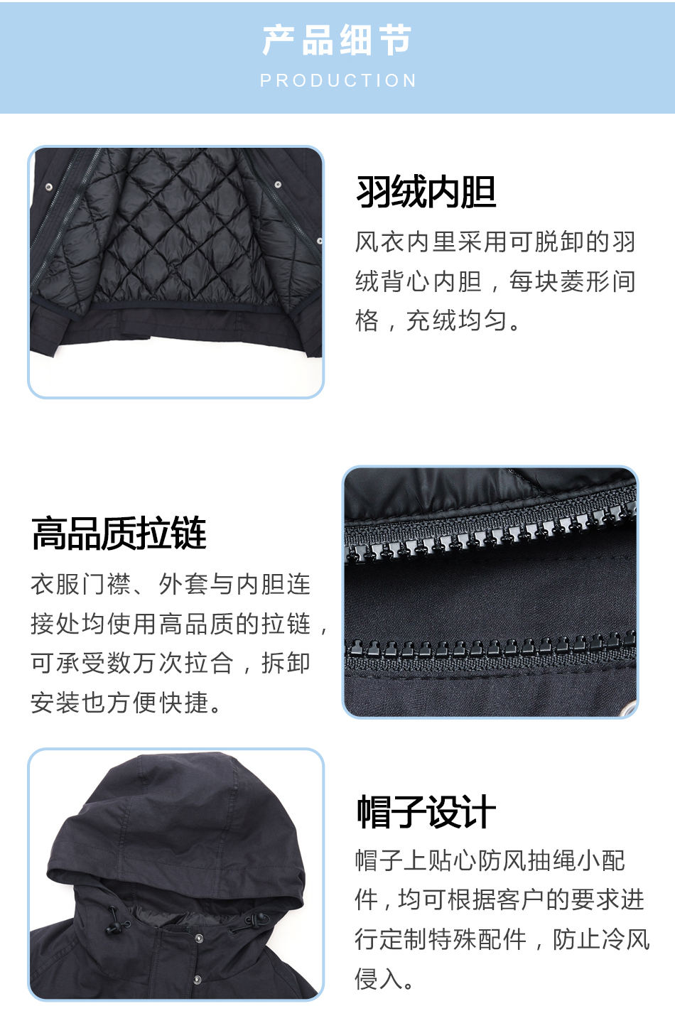 羽絨內(nèi)膽:風衣內(nèi)里采用可脫卸的羽絨背心內(nèi)膽,每塊菱形間格,充絨均勻。
