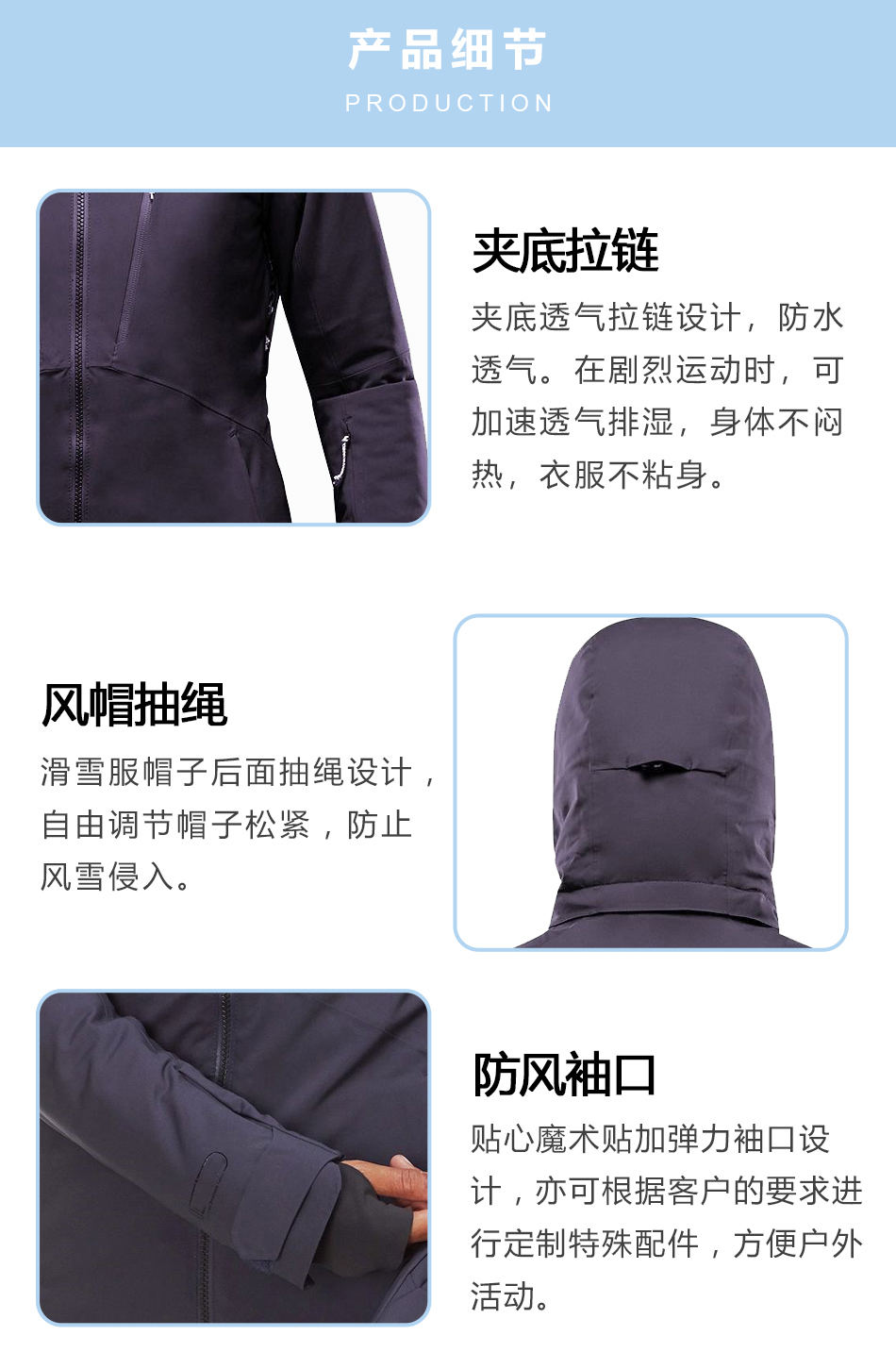 風帽抽繩:防水滑雪服定制出的帽子后面抽繩設(shè)計,自由調(diào)節(jié)帽子松緊,防止風雪侵入。