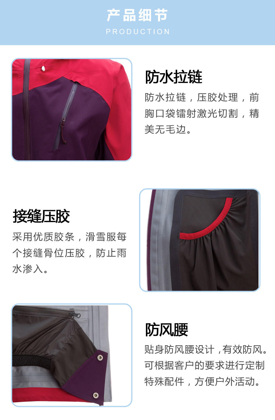 接縫壓膠:壓膠滑雪服生產(chǎn)采用優(yōu)質(zhì)膠條,滑雪服每個(gè)接縫骨位壓膠,防止雨水滲入。
